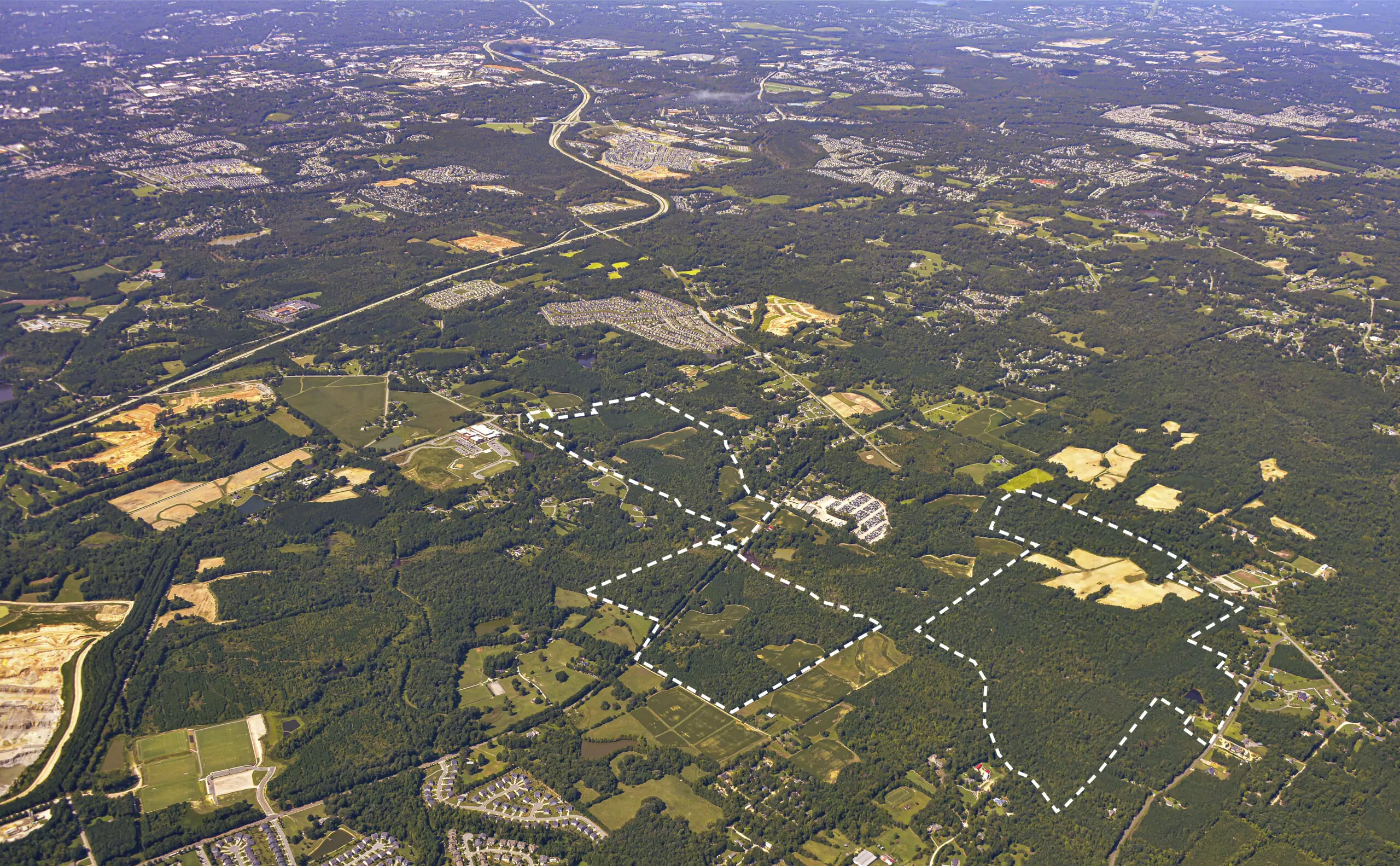 The project is situated off Old Crews Road north of Knightdale on a disjointed site totaling 268 acres across two unconnected assemblages. The land is owned by a collection of LLCs and individual landowners.